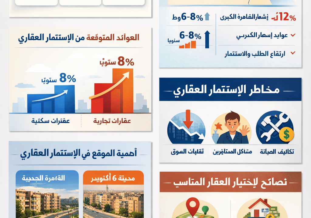 جواب: العوائد من الاستثمار العقاري تتفاوت حسب نوع العقار والموقع. بالنسبة للعقارات السكنية، يمكن أن تتراوح العوائد من 6% إلى 8% سنويًا، في حين أن العقارات التجارية قد تقدم عوائد أعلى تتراوح من 8% إلى 12% سنويًا، خاصة في المواقع التجارية المرموقة.